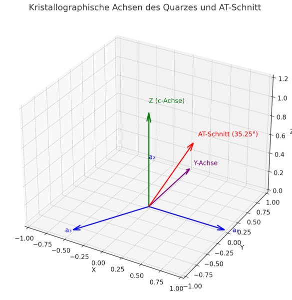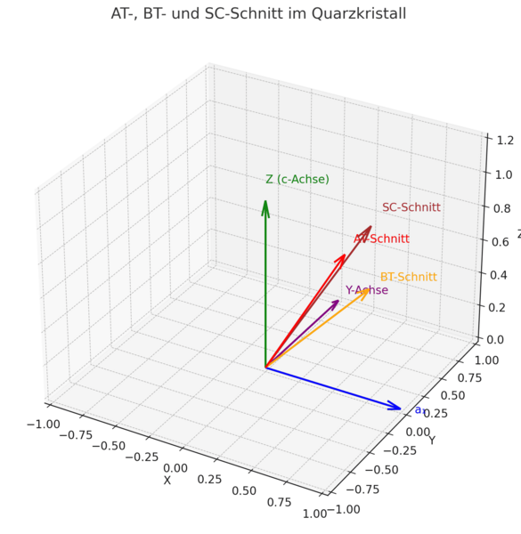 To wyjaśnienie opisuje osie krystalograficzne syntetycznego kryształu kwarcu i różne rodzaje cięcia (AT, BT i SC) stosowane w produkcji kryształów kwarcu.