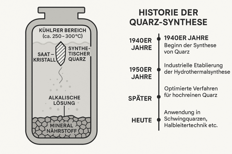 - W latach czterdziestych XX wieku rozpoczęto syntezę kwarcu w tak zwanych zakładach hydrotermalnych - procesie imitującym naturalne warunki wzrostu.
